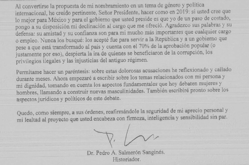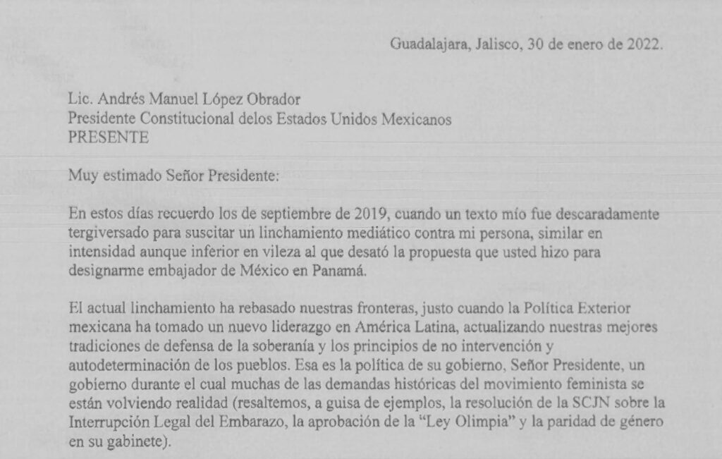 el 30 de enero de 2022, en la que pone «a su disposición mi declinación al cargo» de embajador de México en Panamá.