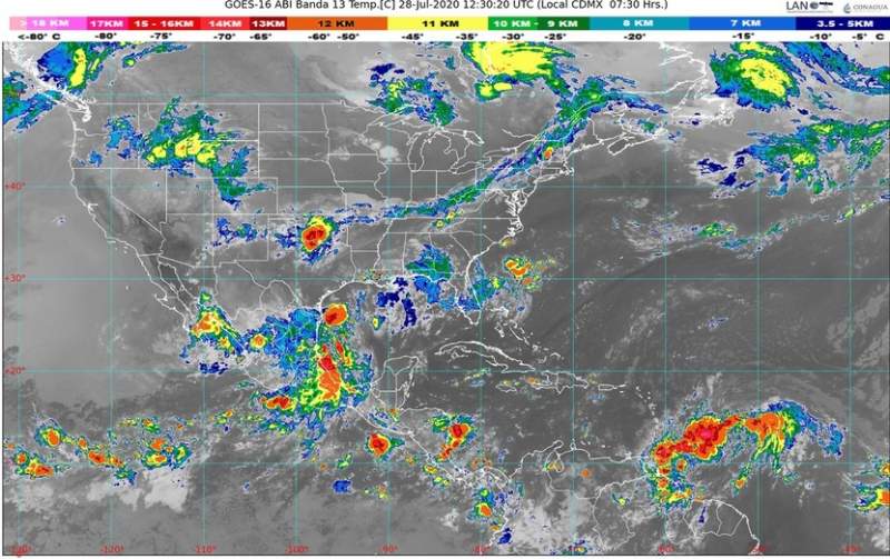 Un sistema de alta presión en niveles medios de la atmósfera mantendrá temperaturas máximas de 45 a 50 grados Celsius en Baja California; de 40 a 45 grados Celsius en Sonora, y de 35 a 40 grados Celsius en Baja California Sur, Campeche, Guerrero, Michoacán, Nayarit, Oaxaca, Quintana Roo, Sinaloa, Tabasco y Yucatán.