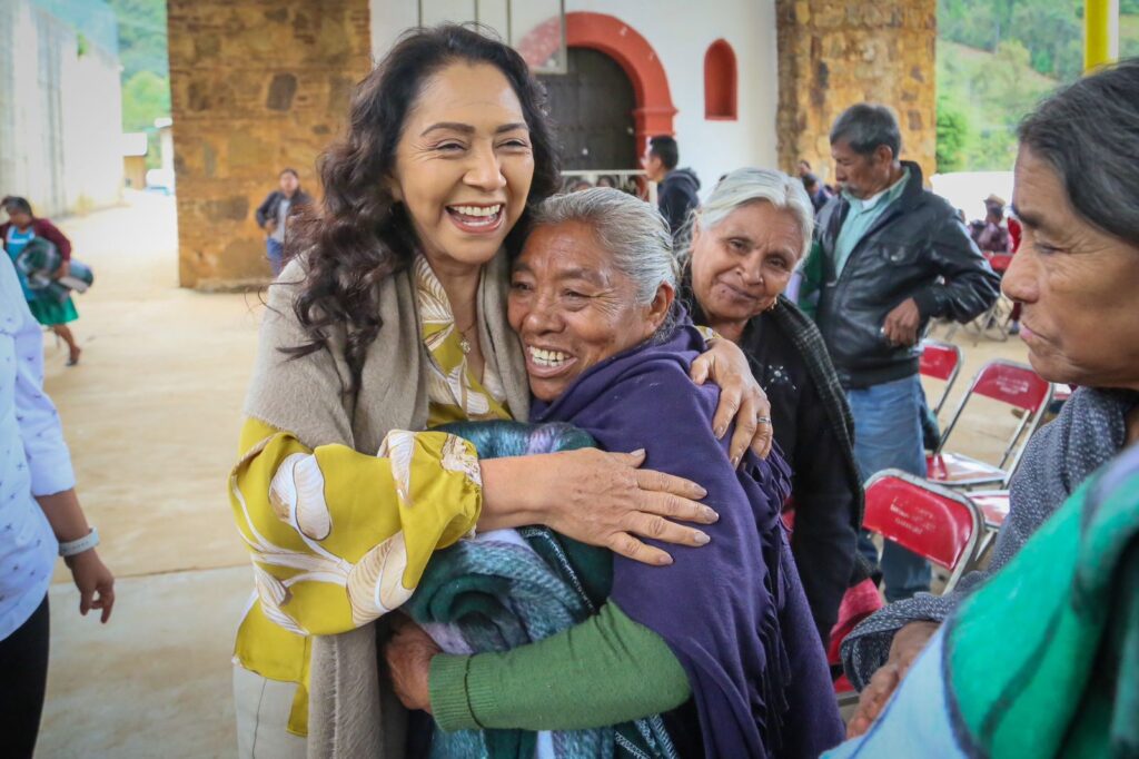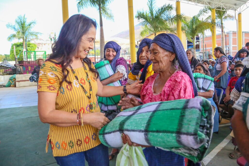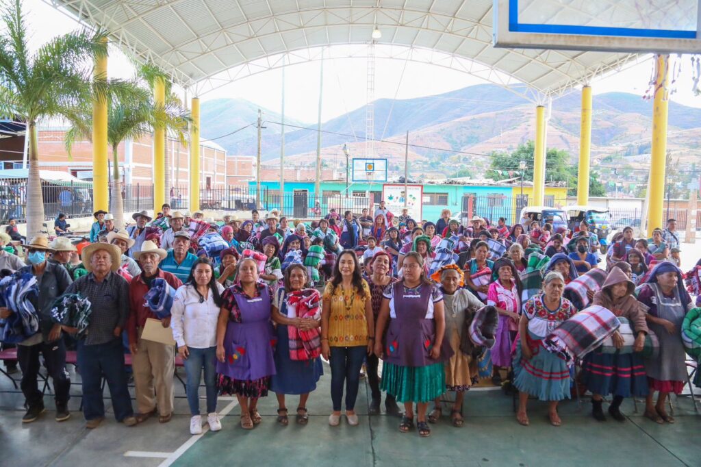 La programación continuó por los municipios de Magdalena Teitipac y Santa Cruz Papalutla, en donde la Presidenta Honoraria entregó de manera directa las cobijas a habitantes de la comunidad, enfocada principalmente a las personas adultas mayores.