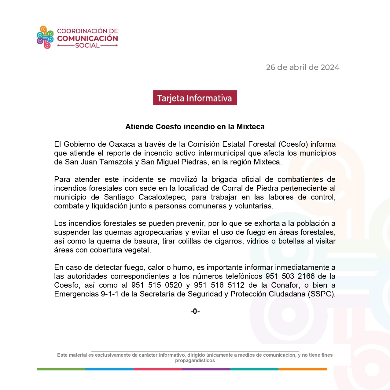 El Gobierno de Oaxaca a través de la Comisión Estatal Forestal (Coesfo) informa que atiende el reporte de incendio activo intermunicipal que afecta los municipios de San Juan Tamazola y San Miguel Piedras, en la región Mixteca.