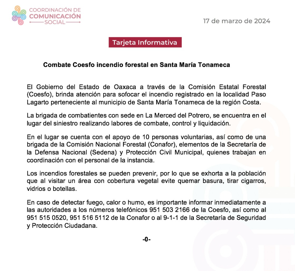 El Gobierno del Estado de Oaxaca a través de la Comisión Estatal Forestal (Coesfo), brinda atención para sofocar el incendio registrado en la localidad Paso Lagarto perteneciente al municipio de Santa María Tonameca de la región Costa.