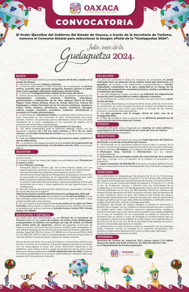Santa Lucía del Camino, Oax. 28 de noviembre de 2023.- El Gobierno del Estado a través de la Secretaría de Turismo (Sectur) dio a conocer la convocatoria al Concurso Estatal para seleccionar la imagen oficial de la Guelaguetza 2024, la cual está dirigida a oaxaqueñas y oaxaqueños mayores de 18 años que tengan interés y que deseen plasmar una imagen que sea alusiva a “nuestra máxima fiesta”, así lo aseguró la titular de la dependencia, Saymi Pineda Velasco.