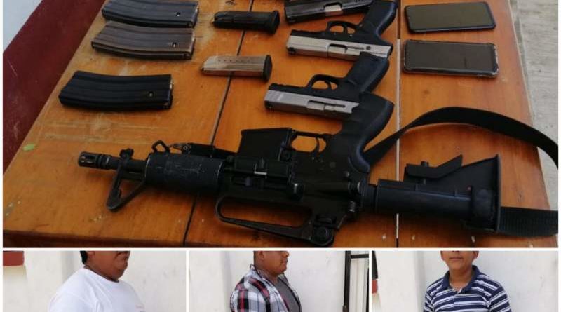 De ello resultó la detención de quienes se identificaron como Fidel N. N., Simón N. N. y Cornelio N. N., de 18, 36 y 34 años de edad, respectivamente; a quienes también les fueron aseguradas tres armas cortas y un arma larga; al igual que cargadores, portacargadores y un radio de intercomunicación.