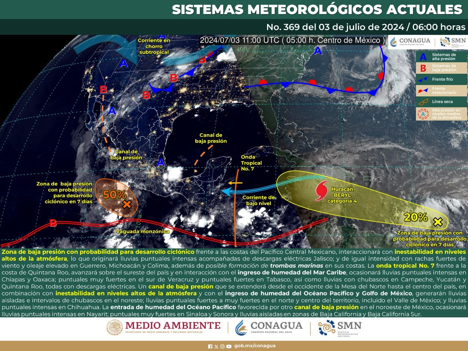 El huracán Beryl de gran intensidad sigue desplazándose por aguas del Mar Caribe con impacto directo, este día, sobre Jamaica, por su lejanía no representa peligro para el territorio mexicano; sin embargo, se mantiene en vigilancia.
