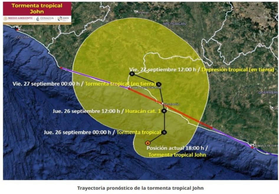 La tormenta tropical “John” incrementa la velocidad del viento cerca de la costa de Guerrero; a las 18:00 horas de este miércoles se localizó a 90 kilómetros (km) al sur-suroeste de Zihuatanejo, Guerrero y a 145 km al sureste de Lázaro Cárdenas, Michoacán.