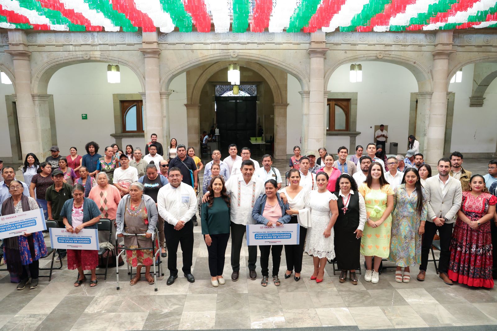 Oaxaca de Juárez, Oax. 6 de septiembre de 2023.- Para resarcir el daño ocasionado a las familias oaxaqueñas víctimas de fraude por el cierre masivo de cajas de ahorro, el Gobernador Salomón Jara Cruz y la Presidenta Honoraria del Sistema DIF Oaxaca Irma Bolaños Quijano realizaron la entrega simbólica de cheques que beneficiarán en una primera entrega a 92 personas defraudadas de los Valles Centrales, con una inversión mayor a un millón 65 mil pesos.