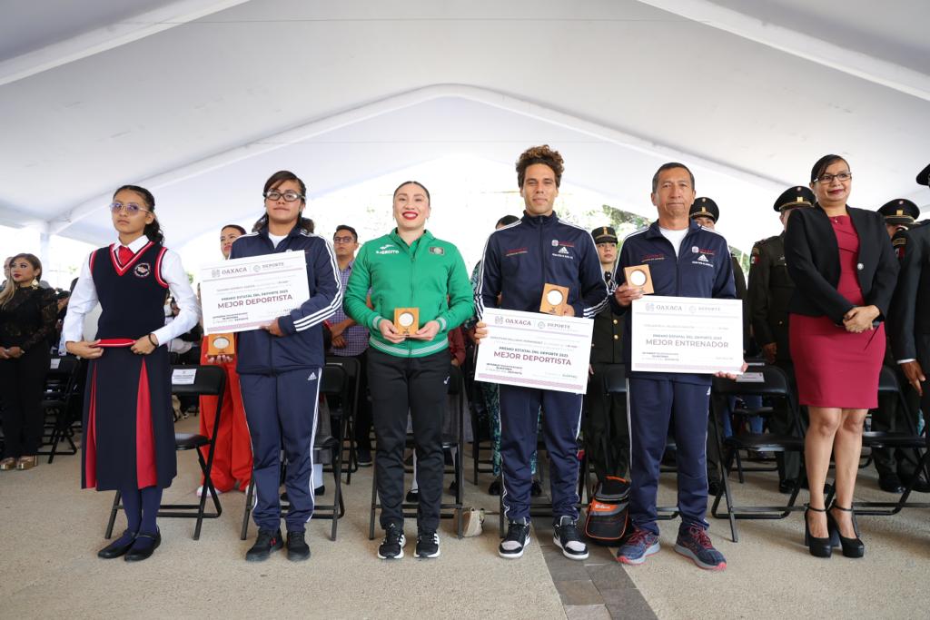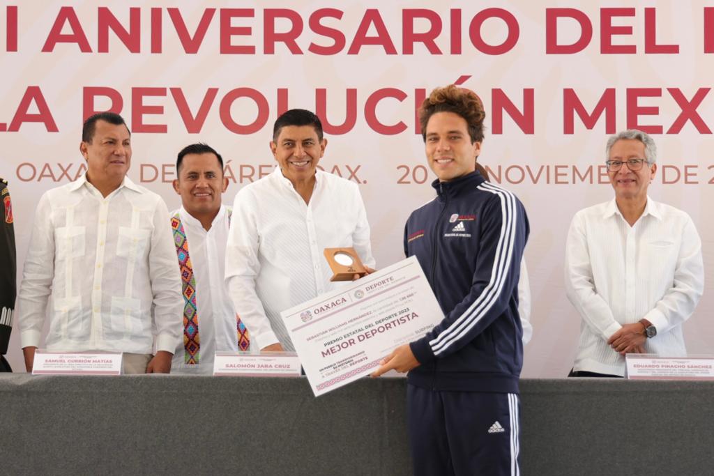 En el marco de este acto conmemorativo, el Gobernante oaxaqueño entregó el Premio Estatal del Deporte 2023 a la nadadora Sahara Monroy García, la karateca Xhunashi Guadalupe Caballero Santiago, el surfista Sebastián Williams Hernández y el entrenador de natación Guillermo Velasco Aragón.