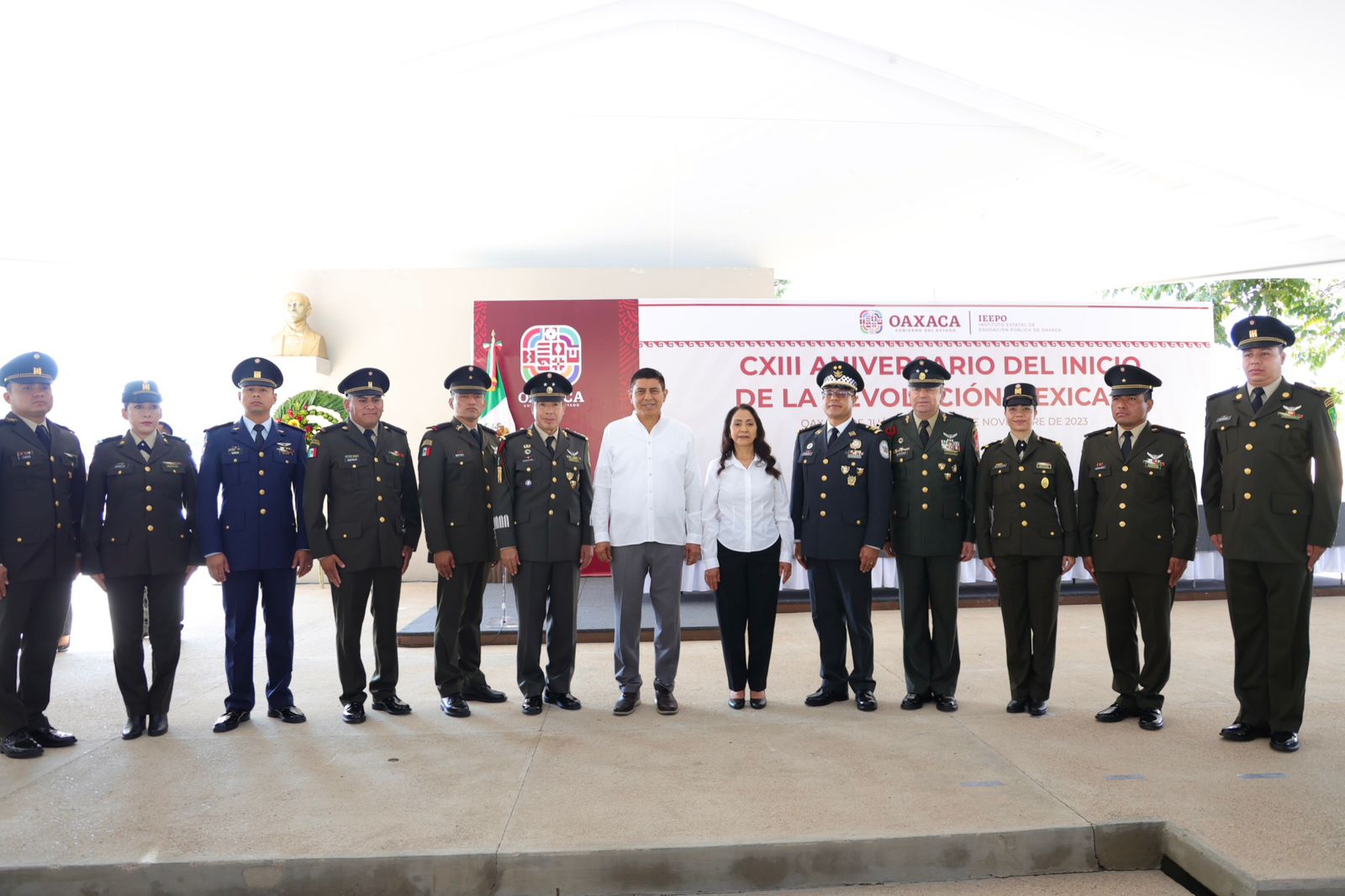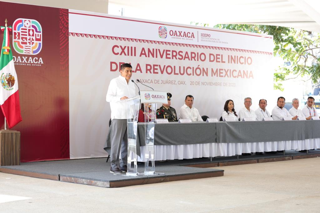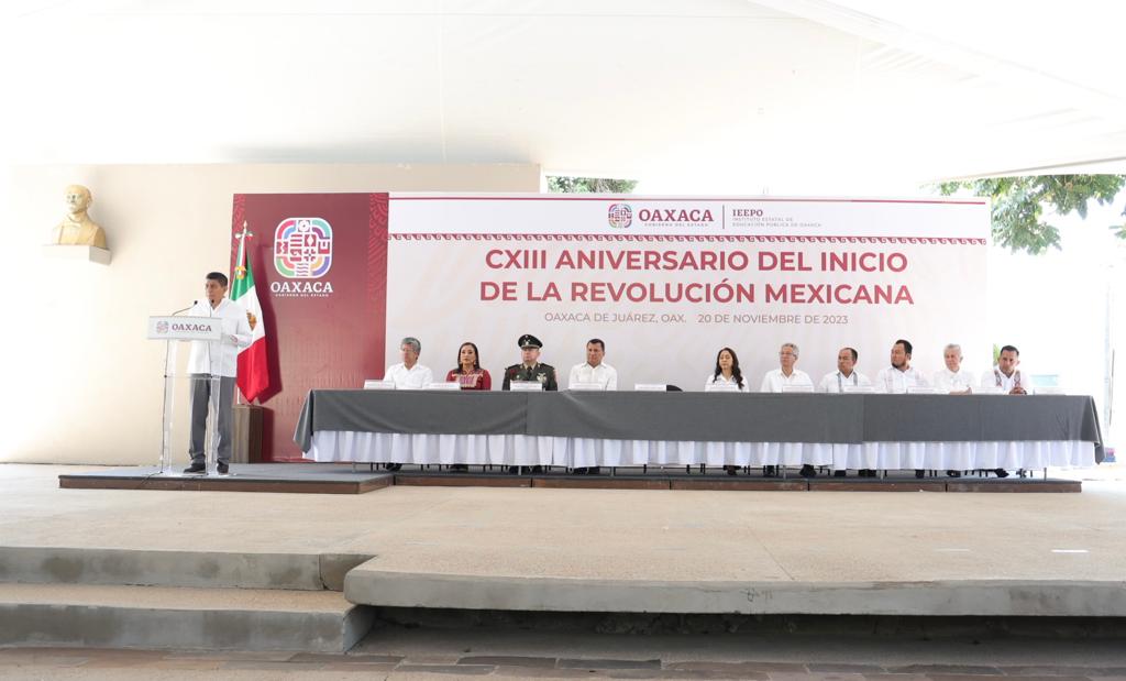 Oaxaca de Juárez, Oax. 20 de noviembre de 2023.- “La libertad no se conquista de rodillas, sino de pie; la rebeldía es la vida, la sumisión es la muerte”, señaló el Gobernador del Estado Salomón Jara Cruz al participar en representación de los tres Poderes del Estado en la Ceremonia Conmemorativa del CXIII Aniversario del Inicio de la Revolución Mexicana, la tercera transformación de la Patria.