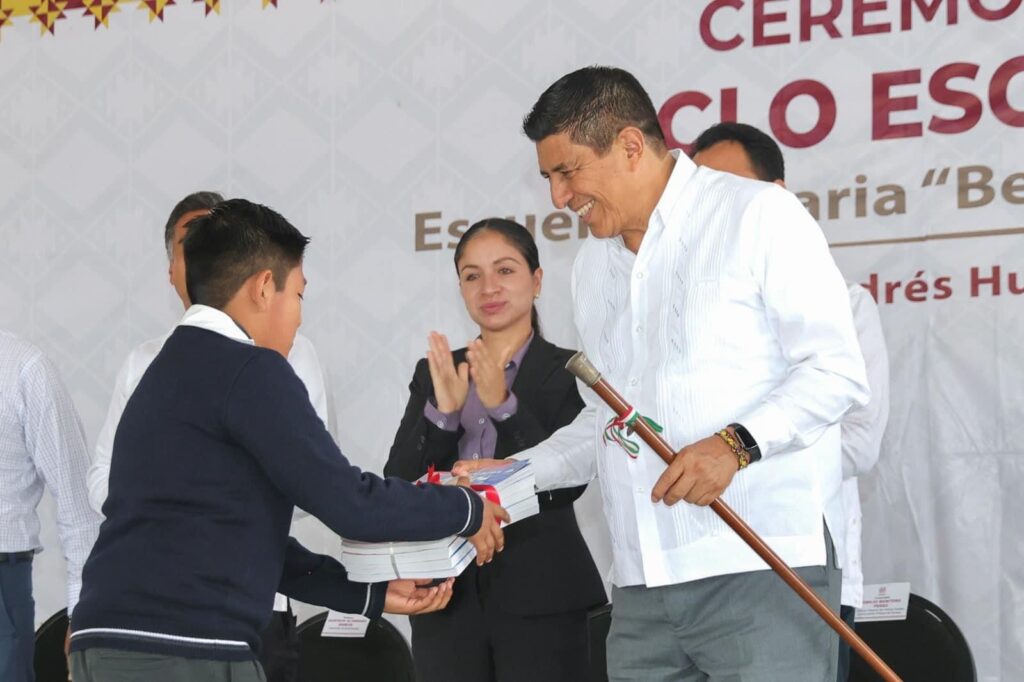 • El Mandatario Oaxaqueño entregó paquetes de libros a estudiantes de la Escuela Primaria “Benito Juárez” en San Andrés Huayápam