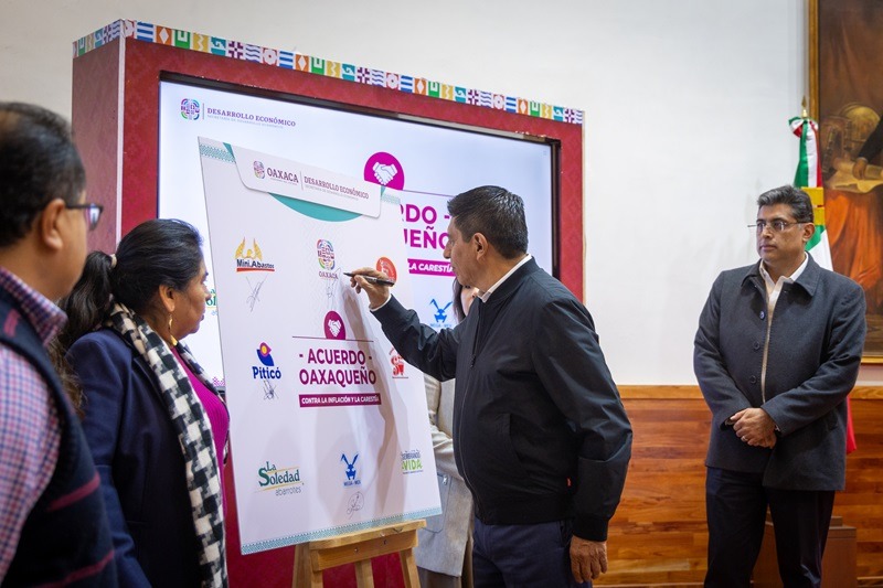Oaxaca de Juárez, Oax. 9 de diciembre de 2024.- En un esfuerzo conjunto por apoyar la economía de las familias, el Gobernador Salomón Jara Cruz firmó con el sector primario del programa Sembrando Vida y principales cadenas abarroteras mayoristas locales, el Acuerdo Oaxaqueño contra la inflación y la carestía, que establece el precio de la canasta básica de la entidad en 910 pesos.
