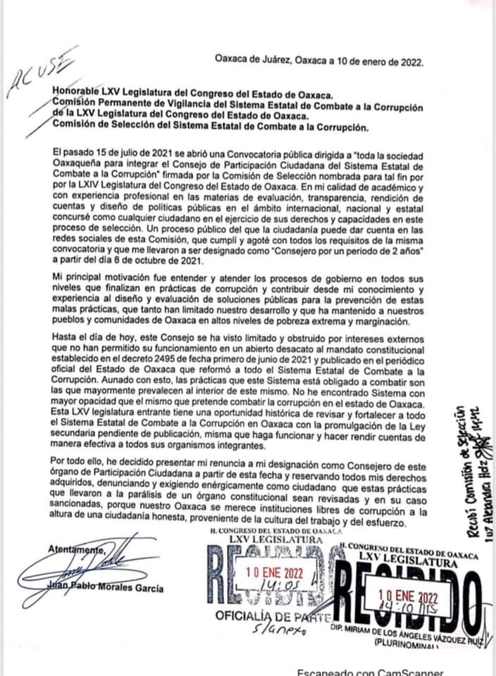 El pasado 10 enero, el Mtro. Juan Pablo Morales García presentó su renuncia como integrante de Consejo de Participación Ciudadana del Sistema Estatal de Combate a la Corrupción, denunciado: «No he encontrado Sistema con mayor opacidad que el mismo que pretende combatir la corrupción en el estado de Oaxaca».