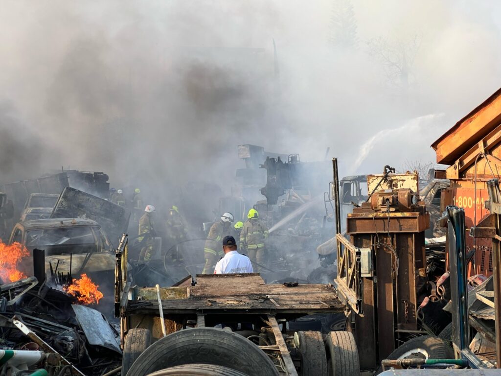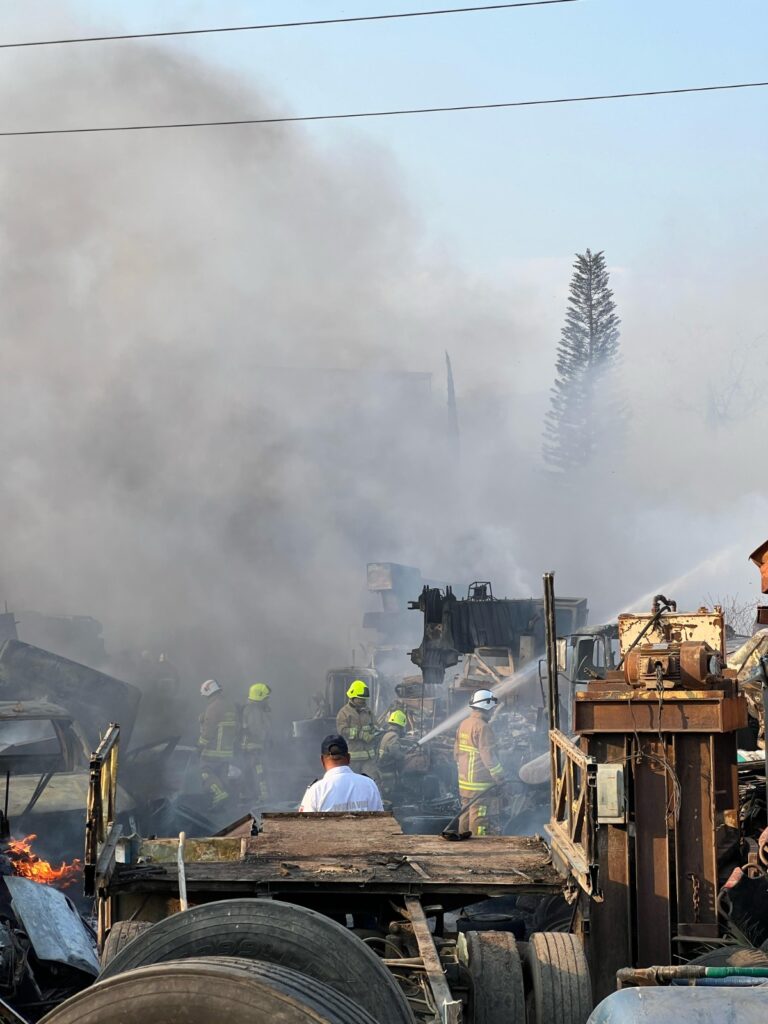 Oaxaca de Juárez, Oax., 1 de abril de 2024.- Integrantes del Heroico Cuerpo de Bomberos de Oaxaca (HCBO) dependiente de la Secretaría de Seguridad y Protección Ciudadana (SSPC) atiende un incendio generado al interior de un deshuesadero en la colonia Exhacienda Candiani, en Oaxaca de Juárez.