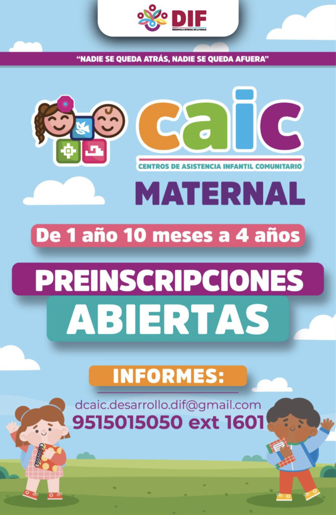 Oaxaca de Juárez, Oax. 18 de enero de 2024.- Del 1 al 15 de febrero, el Sistema para el Desarrollo Integral de la Familia (DIF) Oaxaca llevará a cabo el proceso de preinscripciones en los Centros de Asistencia Infantil Comunitarios (CAIC) de la capital oaxaqueña, Miahuatlán de Porfirio Díaz y Heroica Ciudad de Tlaxiaco, donde se ofrece educación inicial a niñas y niños de un año con 10 meses a cuatro años.