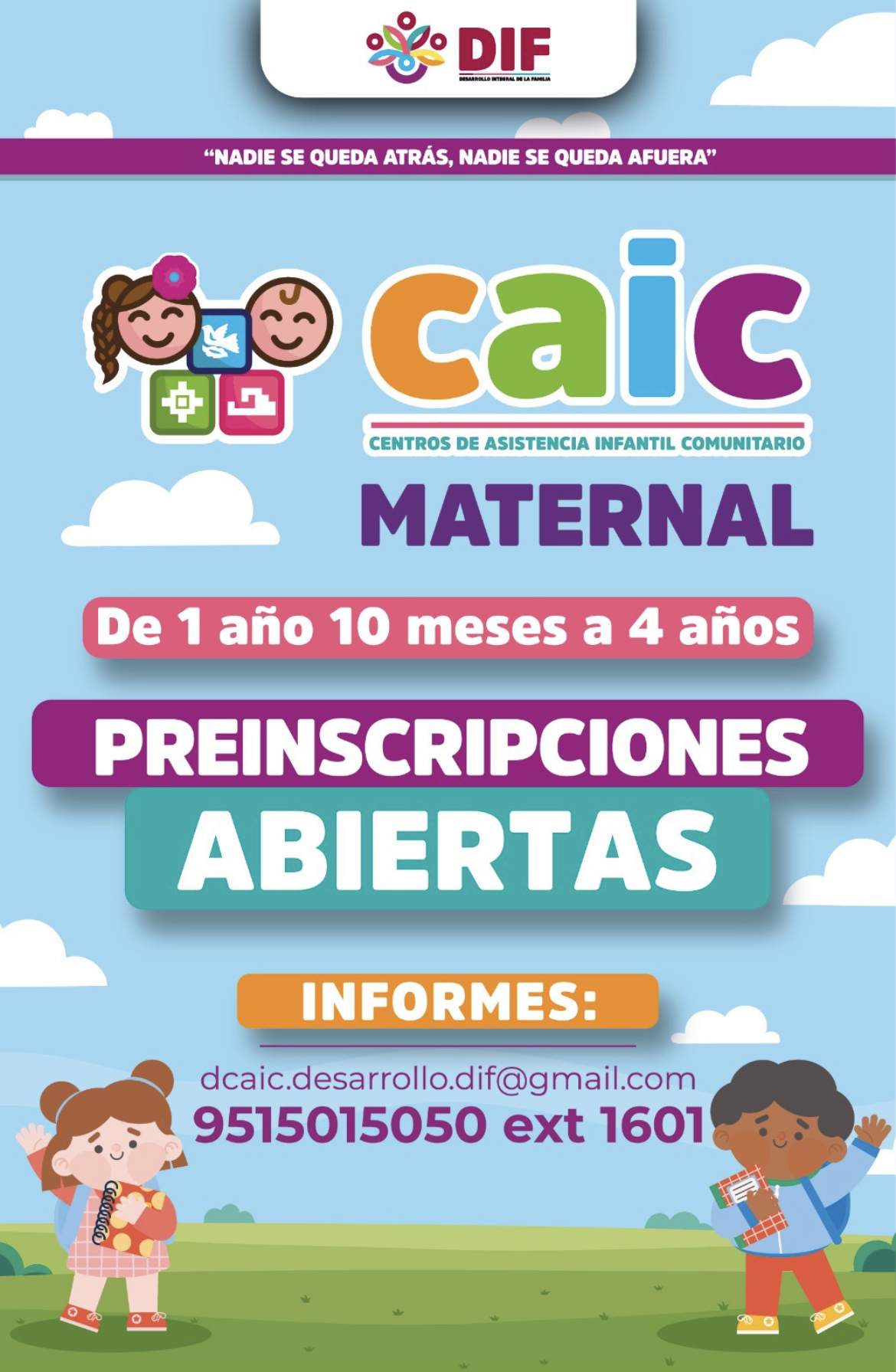 Para mayor información acerca de los servicios, horarios y requisitos, las personas interesadas pueden comunicarse al número telefónico 951 501 50 50 extensión 1601, a la cuenta del correo electrónico dcaic.desarrollo.dif@gmail.com, o bien, acudir directamente a las instalaciones de los CAIC antes mencionados, en un horario de 8:00 a 17:00 horas.