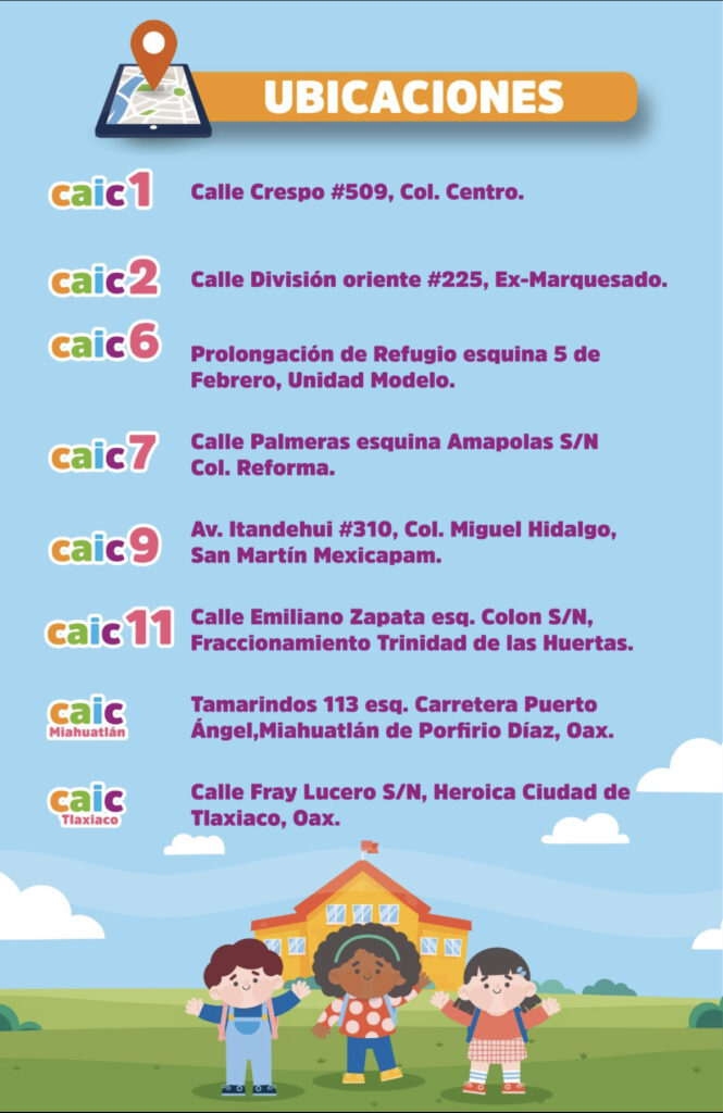 También, la convocatoria está abierta para el CAIC de Miahuatlán de Porfirio Díaz, ubicado en la calle Tamarindos número 113 esquina Carretera Puerto Ángel, y en el CAIC de la Heroica Ciudad de Tlaxiaco, localizado en la calle Fray Lucero s/n.