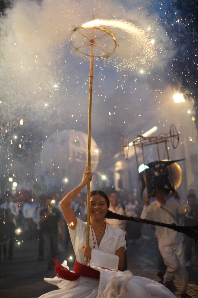 Toritos y ruedas catarinas con sus luces multicolores acompañaron a las orgullosas mujeres de Oaxaca con sus lujosas vestimentas tradicionales, sus largas trenzas, rebozos y pañoletas que acompañaban en sus giros sus amplias faldas en un arcoíris de colores deslumbrantes.