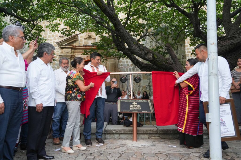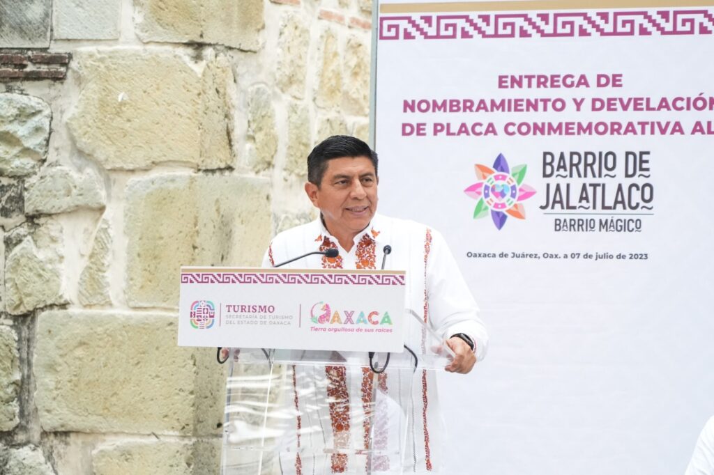 Acompañado por la presidenta honoraria del Sistema para el Desarrollo Integral de la Familia (DIF) Oaxaca, Irma Bolaños Quijano, la secretaria de Turismo del Gobierno del Estado Saymi Pineda Velasco y el presidente del Comvive de Jalatlaco Luis Fernando Navarro, el Mandatario Oaxaqueño develó la placa conmemorativa en el atrio del templo de San Matías luego de que la Secretaría de Turismo del Gobierno Federal declaró Barrio Mágico a este asentamiento histórico de la capital en el pasado Tianguis Turístico celebrado en la Ciudad de México.