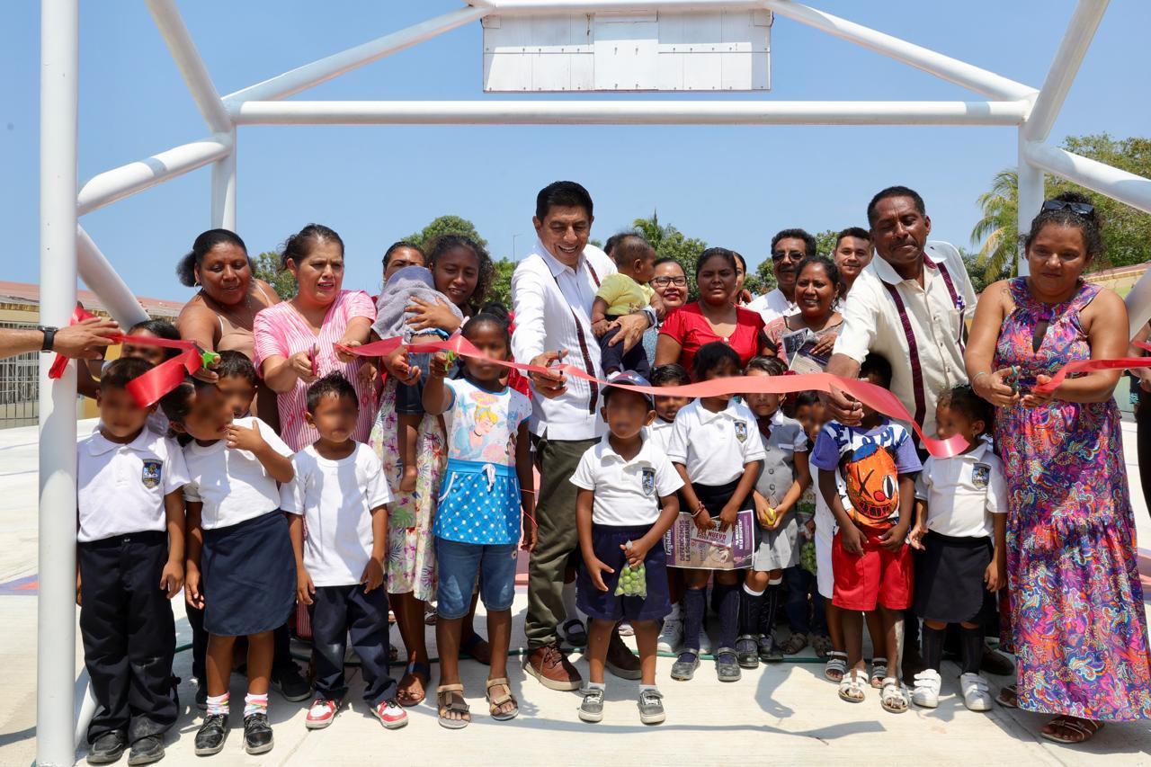 En esta tierra, cuna de la Danza de los Diablos, el Mandatario estatal encabezó la inauguración de la cancha escolar del Jardín de Niños Gabriela Mistral, la cual es un compromiso hecho en su primera visita a Santiago Tapextla, con la estrategia Trabajo que Transforma tu Municipio.