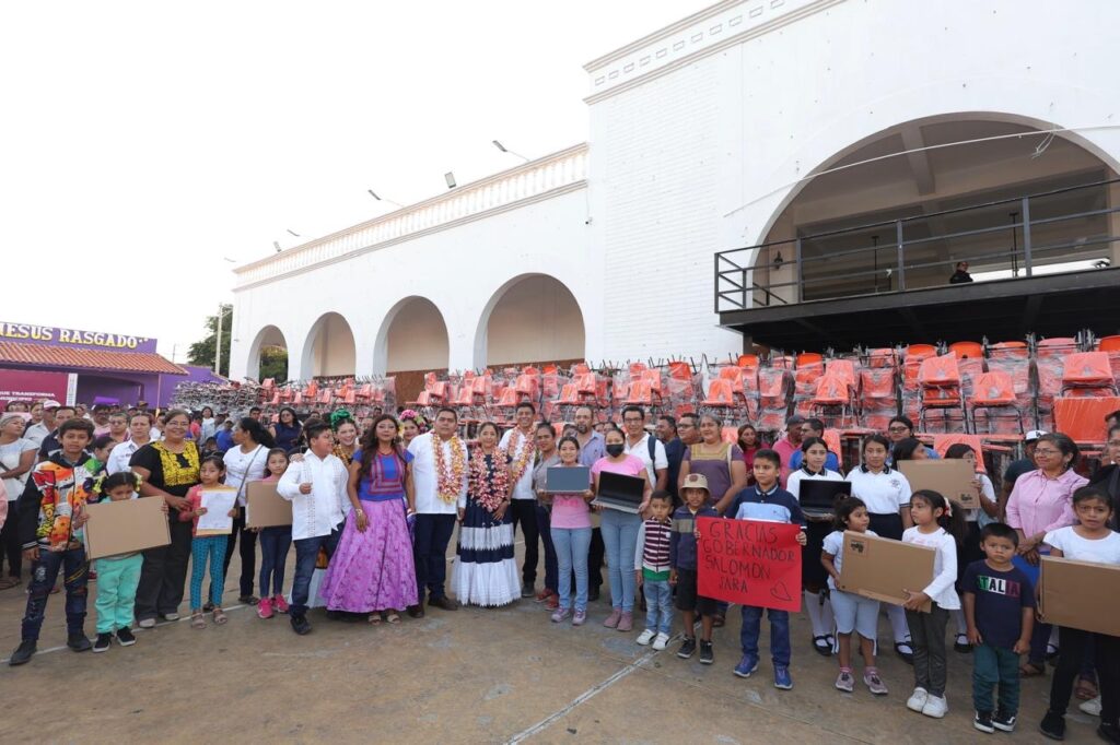 Asunción Ixtaltepec, Oax. 11 de abril de 2025.- En su recorrido de trabajo por este municipio, el Gobernador Salomón Jara Cruz entregó la primera de dos etapas del equipamiento tecnológico y mobiliario a escuelas de educación básica de Asunción Ixtaltepec y, que en total, suman una inversión de 8 millones 866 mil pesos.
