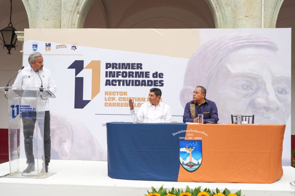 • El mandatario estatal asistió a la presentación del Primer Informe de Actividades del rector de la UABJO, Cristian Carreño López