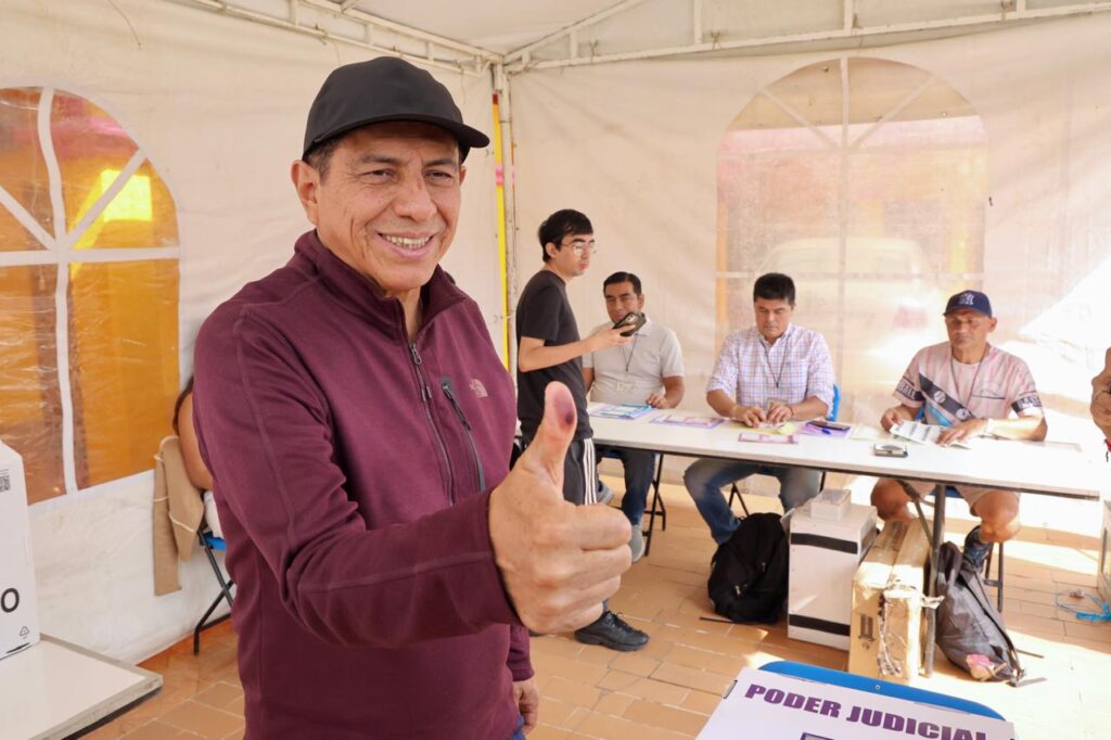 Oaxaca de Juárez, Oax. 1 de junio de 2025.- Después de emitir su voto en la casilla básica, sección 576, en la capital del estado; el Gobernador Salomón Jara Cruz destacó la alta participación ciudadana, que se registra en las primeras horas de esta jornada electoral única e inédita del Poder Judicial de la Federación.