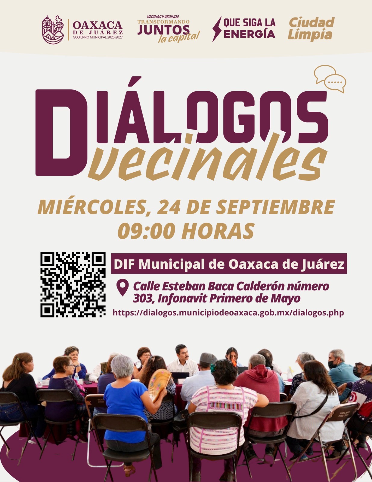 Oaxaca de Juárez, Oax. 22 de septiembre de 2025.– Este miércoles 24 de septiembre a partir de las 9:00 horas, el DIF Municipal de Oaxaca de Juárez, ubicado en la Calle Esteban Baca Calderón número 303, Infonavit Primero de Mayo, será sede de los Diálogos Vecinales en Territorio.