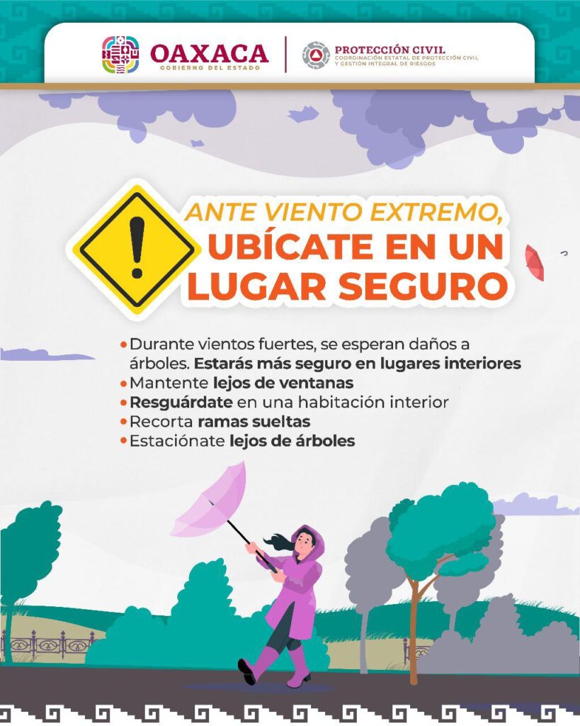Oaxaca de Juárez, Oax. 25 de julio de 2023.- Ante los fuertes vientos que se presentan en esta temporada de lluvias, la Coordinación Estatal de Protección Civil y Gestión de Riesgos (CEPCyGR) emite una serie de recomendaciones a la población para salvaguardar su integridad física y patrimonial.