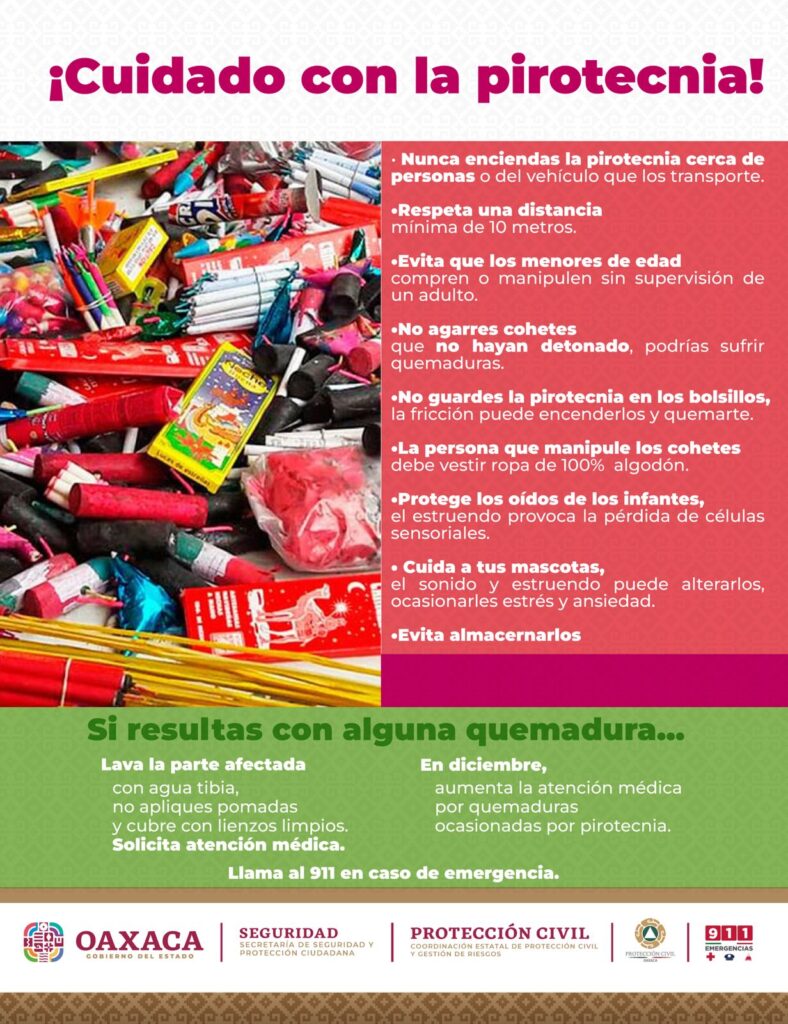 Oaxaca de Juárez, Oax., 13 de julio de 2023.- La Coordinación Estatal de Protección Civil y Gestión de Riesgos (CEPCyGR) recomendó a la población en general que, durante las festividades de Julio, mes de la Guelaguetza, en caso de realizar el manejo y quema de fuegos artificiales, lo haga de manera responsable, además de mantener una distancia adecuada para evitar accidentes, principalmente en el cuidado de los menores de edad.