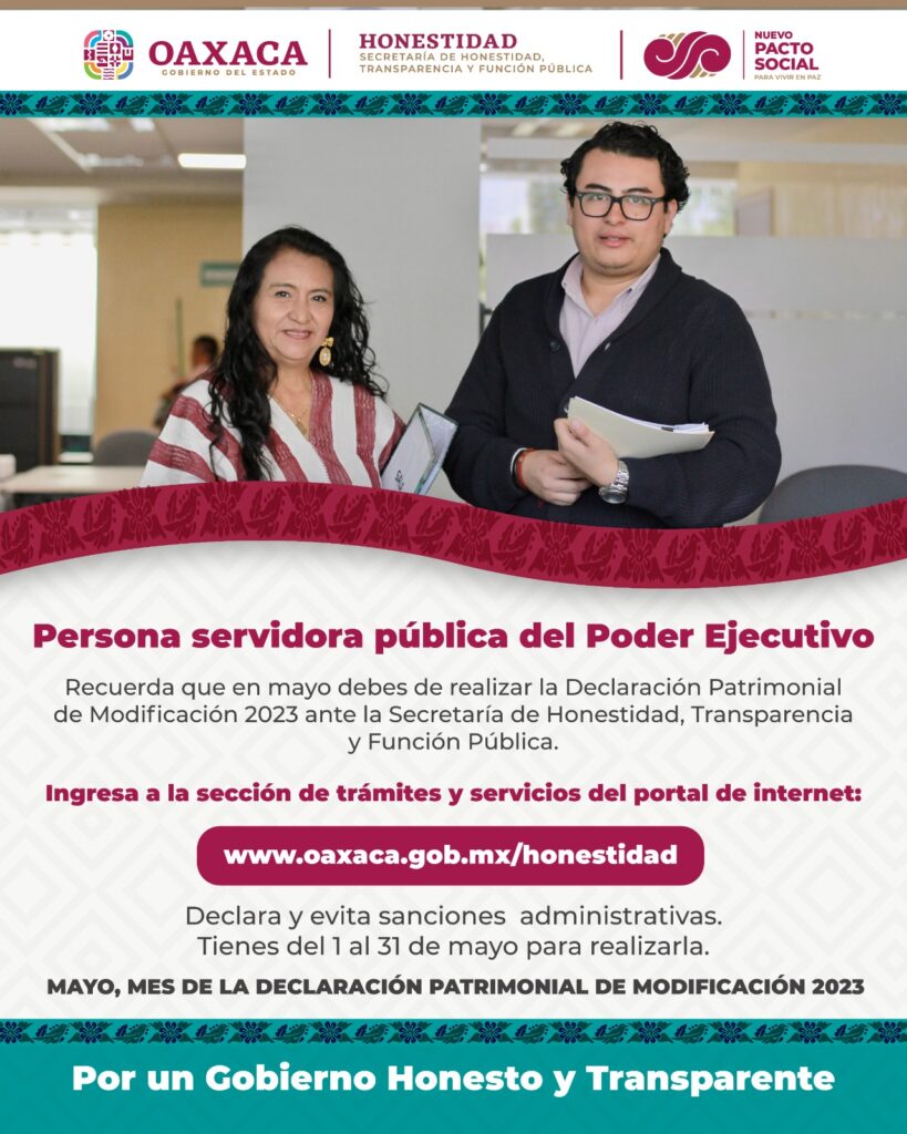 Tlalixtac de Cabrera, Oax. 4 de mayo de 2023.- La Secretaría de Honestidad, Transparencia y Función Pública informó que durante el mes de mayo las personas servidoras públicas del Poder Ejecutivo estatal deben presentar su Declaración Patrimonial de Modificación 2023 e informar si hubo o no cambios a su patrimonio y en su caso, indicar la fecha, valor y medios de adquisición.