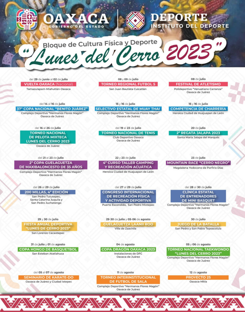 El Bloque de Cultura Física y Deporte Lunes del Cerro 2023 tiene el objetivo de promover la práctica deportiva, el bienestar físico y los hábitos de vida saludables. Tanto participantes como espectadores podrán disfrutar de una amplia gama de eventos y actividades recreativas, porque ¡la Guelaguetza también es deporte!