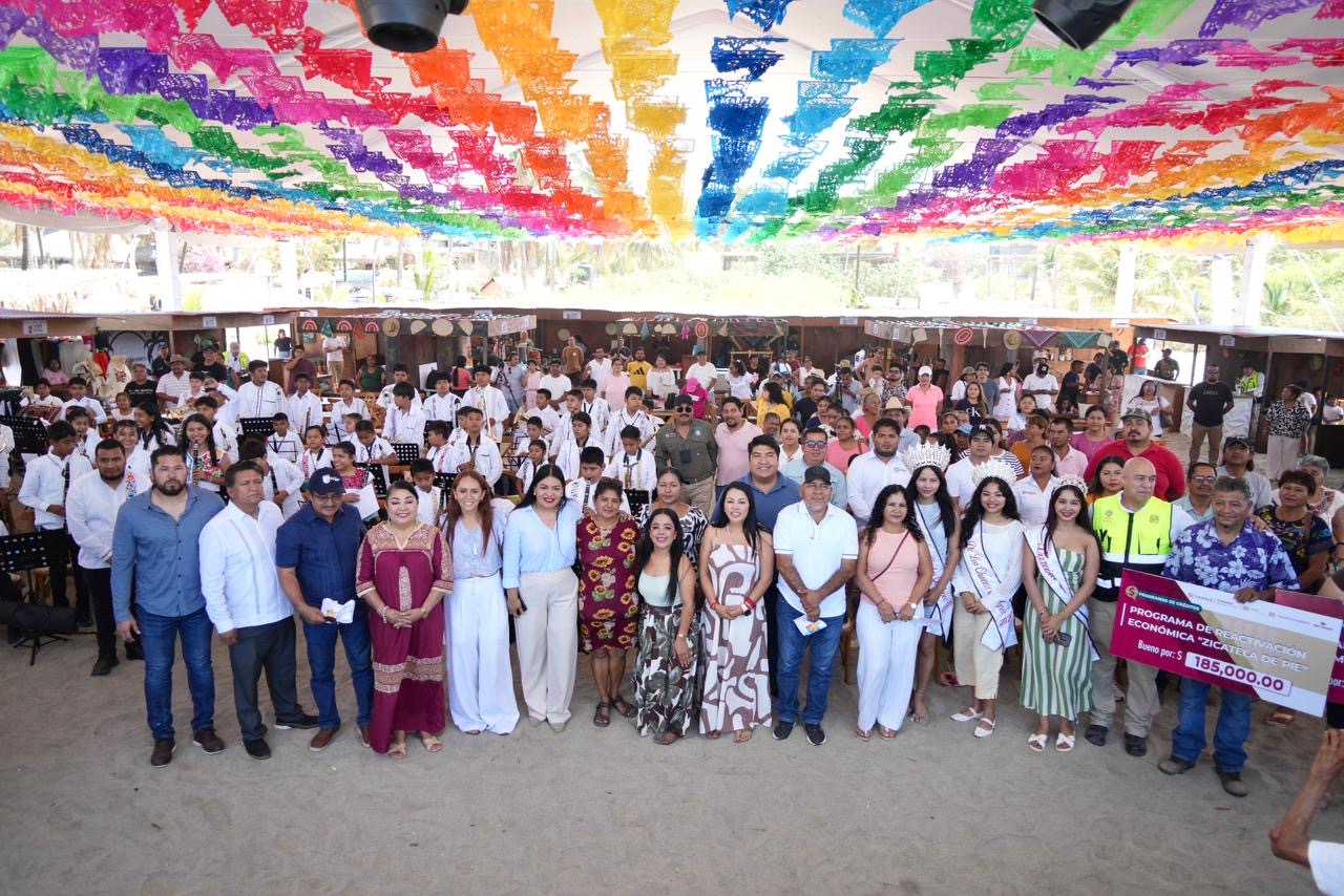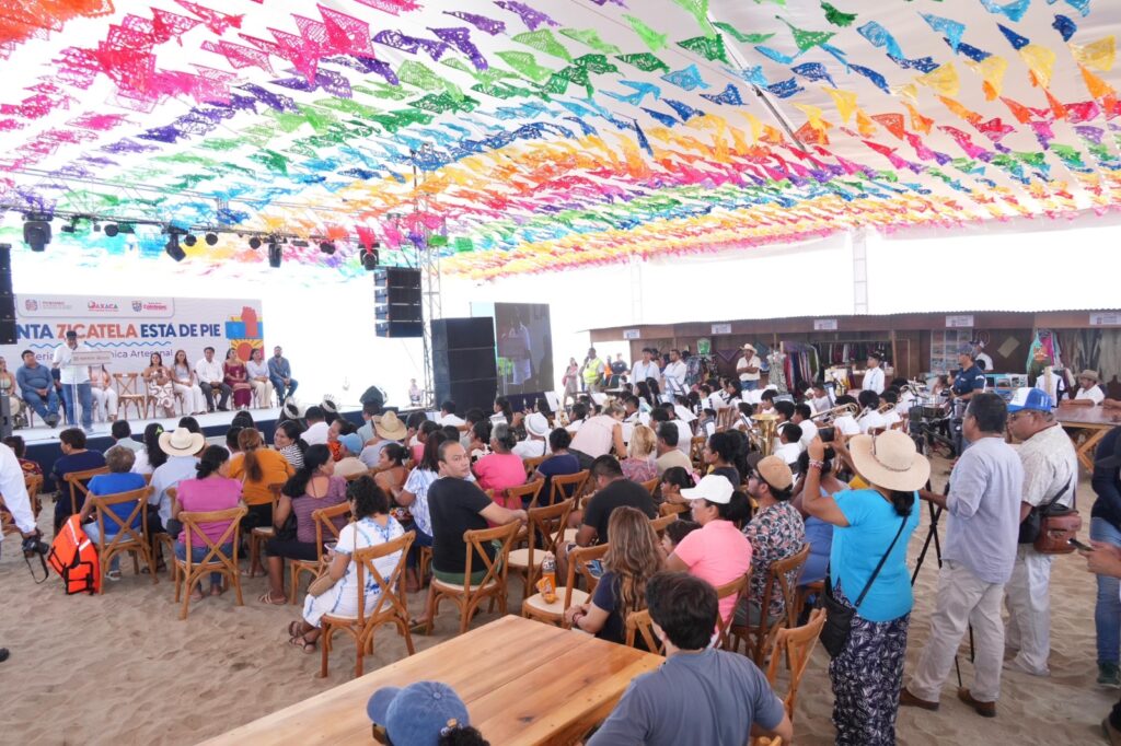 Santa María Colotepec, Oax., 2 de abril de 2026.- Para reactivar la economía de las familias prestadoras de servicios turísticos afectadas por el incendio registrado el pasado mes de marzo, el Gobierno del Estado a través de la Secretaría de Turismo (Sectur Oaxaca) inauguró la feria gastronómica y artesanal “Punta Zicatela está de pie” en Puerto Escondido.