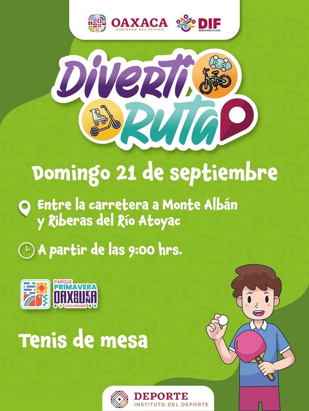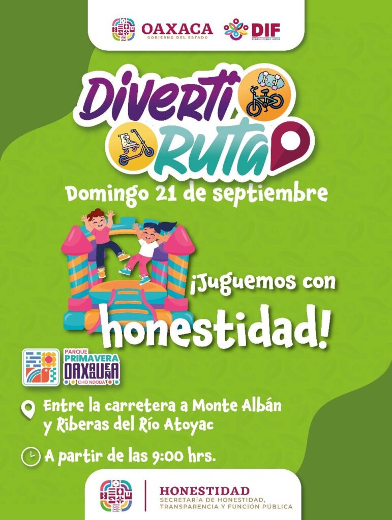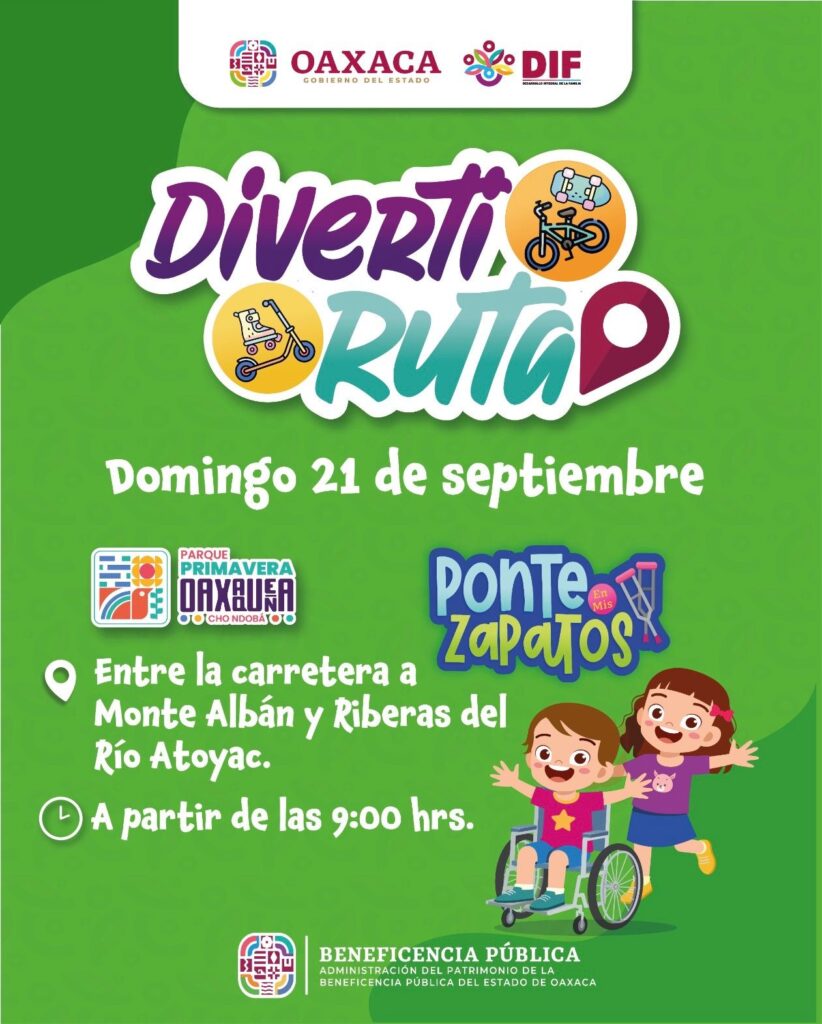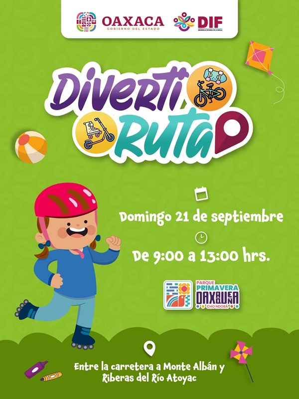 Oaxaca de Juárez, Oax. 18 de septiembre de 2025.- La alegría y diversión se harán presentes en el Parque Primavera Oaxaqueña Cho Ndobá, con la realización de la 43ª Diverti Ruta, que se llevará a cabo este domingo 20 de septiembre, de 9:00 a 13:00 horas.