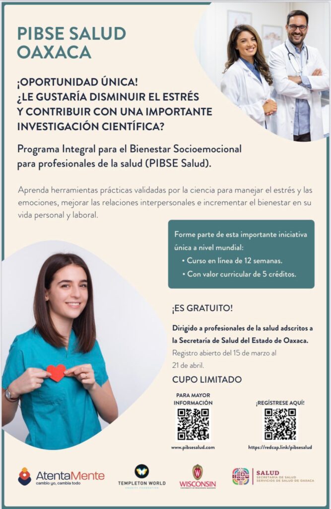 Las personas interesadas podrán inscribirse en la página electrónica: https://www.atentamente.com.mx/pibsesalud o comunicarse al número: 33 3505 6320 con el enlace de Oaxaca, Gabriela López Carrasco de la Asociación Civil “AtentaMente” o escanear el código QR de la convocatoria anexa y si tienen alguna duda o pregunta, pueden escribir al correo electrónico: soporte@pibsesalud.com