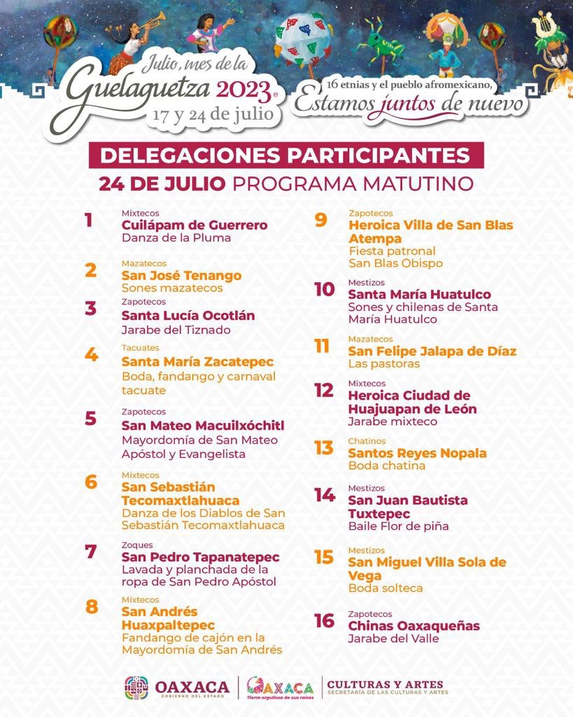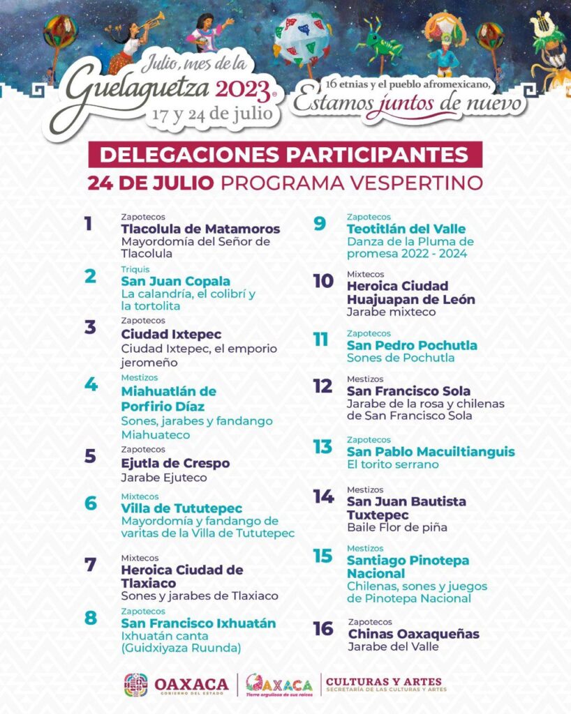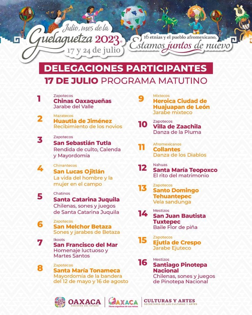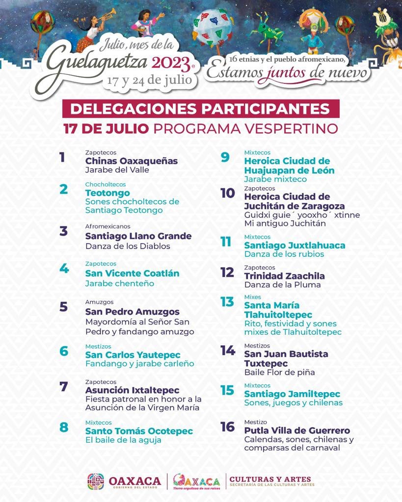 Las delegaciones seleccionadas para la presentación vespertina del Lunes del Cerro del 17 de julio, son: