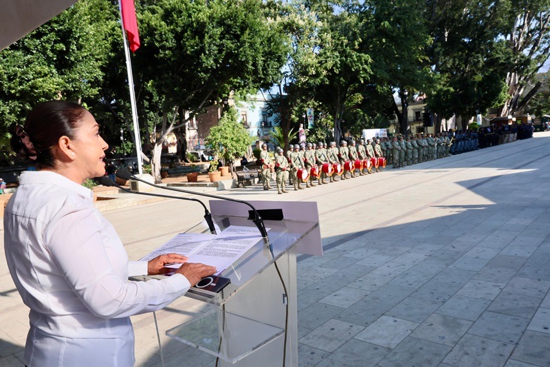 Al encabezar la ceremonia de izamiento de la Bandera Nacional en la Alameda de León destacó el ejemplo de resistencia y convicción de María Josefa Crescencia Ortiz Téllez-Girón, Gertrudis Bocanegra, María Soto, María Ignacia Rodríguez de Velasco, Petra Arellano, Francisca Torres, y muchas más que contribuyeron a marcar el rumbo del país, y han llevado a que por primera vez, México es encabezado por una mujer Presidenta.