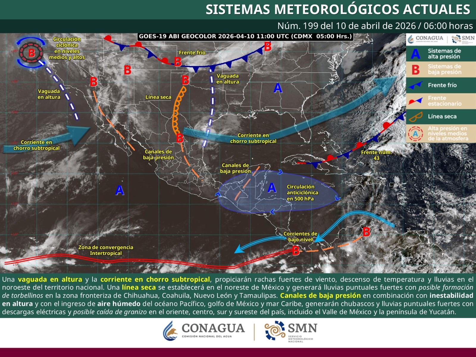 Estas condiciones son ocasionadas por la presencia de un canal de baja presión ubicado sobre el sureste de México, en interacción con la afluencia de humedad proveniente del Océano Pacífico.