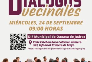 Oaxaca de Juárez, Oax., 9 de septiembre de 2025.- El Gobierno Municipal de Oaxaca de Juárez convoca a todas las vecinas y vecinos a participar en la próxima edición de los Diálogos Vecinales, un ejercicio de cercanía y escucha directa con la ciudadanía.