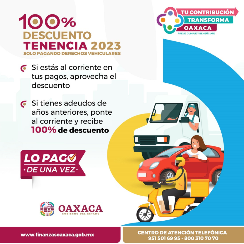 De acuerdo con lo aprobado en la Ley de Ingresos del Estado de Oaxaca para el ejercicio fiscal 2023 las y los contribuyentes pueden beneficiarse con el estímulo fiscal de hasta 100 por ciento del Impuesto Sobre Tenencia o Uso de Vehículos y de las actualizaciones y recargos; así como de 100 por ciento de las actualizaciones y recargos que generen los derechos vehiculares relacionados.
