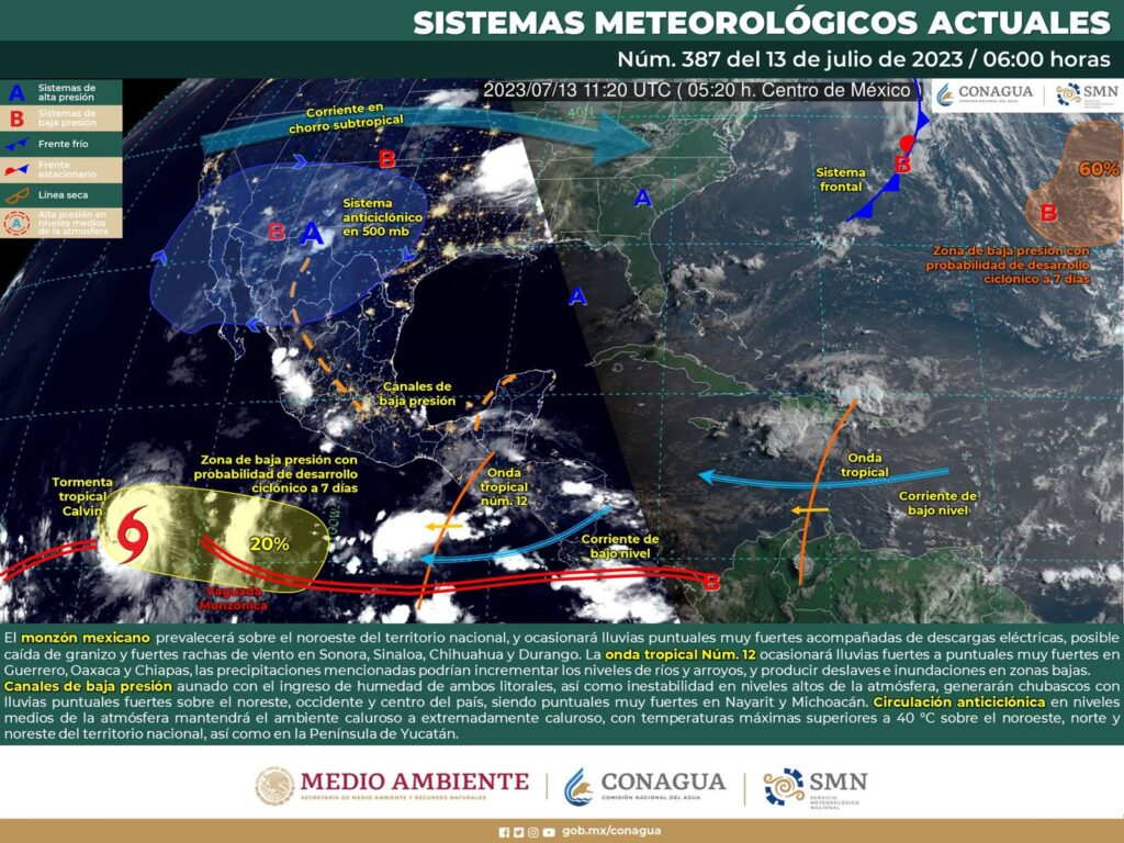 Oaxaca de Juárez, Oax. 13 de julio de 2023.- La Coordinación Estatal de Protección Civil y Gestión de Riesgos (CEPCyGR) informa que debido al pronóstico emitido por la Comisión Nacional del Agua (Conagua) se esperan condiciones meteorológicas asociadas con lluvias, actividad eléctrica, rachas de viento y chubascos en la entidad oaxaqueña.