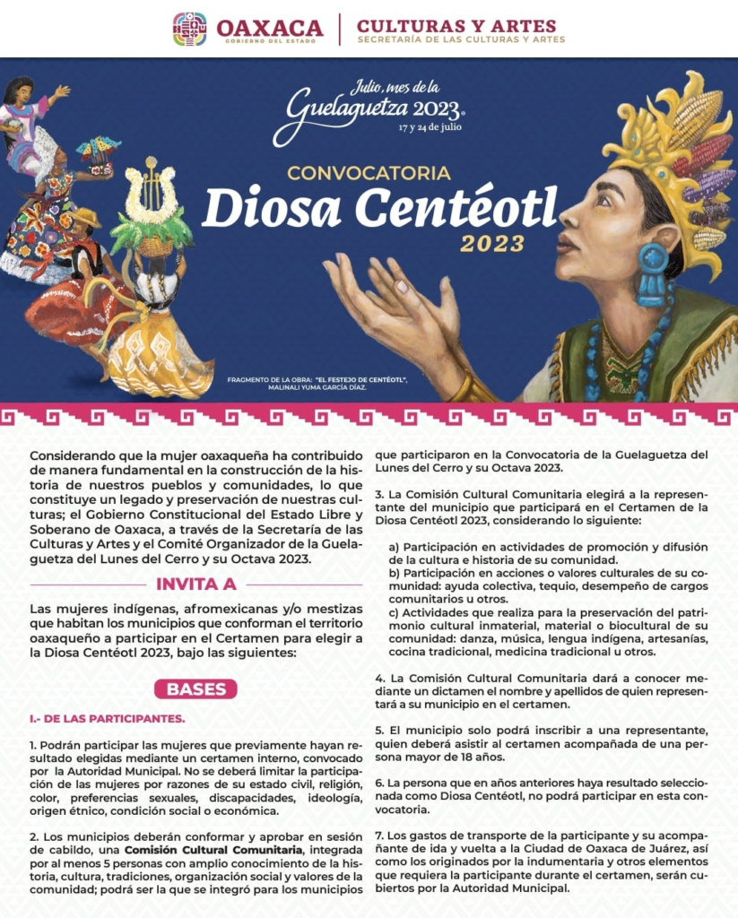 Oaxaca de Juárez, Oax. 12 de mayo de 2023.- La Secretaría de las Culturas y Artes de Oaxaca da a conocer las bases de la Convocatoria Diosa Centéotl 2023 para elegir a la máxima representante de la Guelaguetza en la edición del próximo mes de julio.