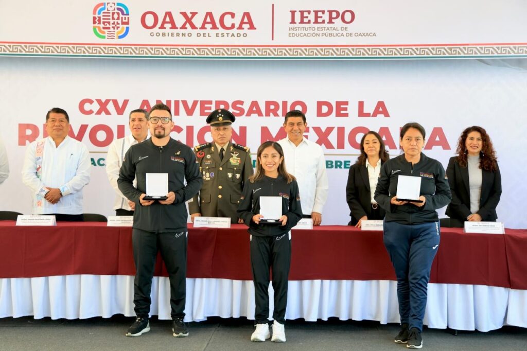 • El Mandatario estatal junto a la Presidenta Honoraria del Sistema DIF Oaxaca, Irma Bolaños Quijano, entregó el Premio Estatal del Deporte 2025 en Ceremonia del 115 Aniversario del Inicio de este movimiento popular