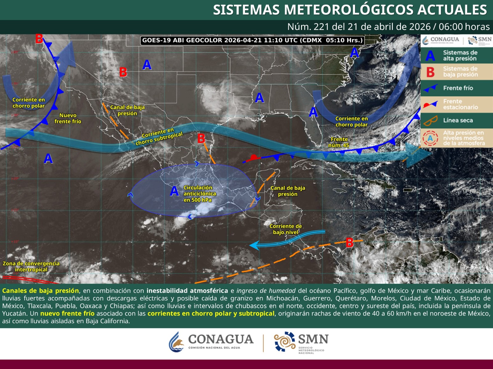 Oaxaca de Juárez, Oax. 21 de abril de 2026.- La Coordinación Estatal de Protección Civil y Gestión de Riesgos (CEPCyGR) informa que, durante la tarde y noche de este martes, se prevén aguaceros acompañados de tormentas eléctricas, rachas fuertes de viento y posible caída de granizo en las regiones Sierra Sur y Mixteca.