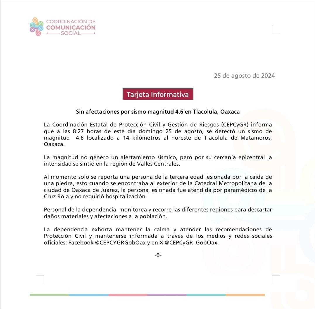 La Coordinación Estatal de Protección Civil y Gestión de Riesgos (CEPCyGR) informa que a las 8:27 horas de este día domingo 25 de agosto, se detectó un sismo de magnitud 4.6 localizado a 14 kilómetros al noreste de Tlacolula de Matamoros, Oaxaca.